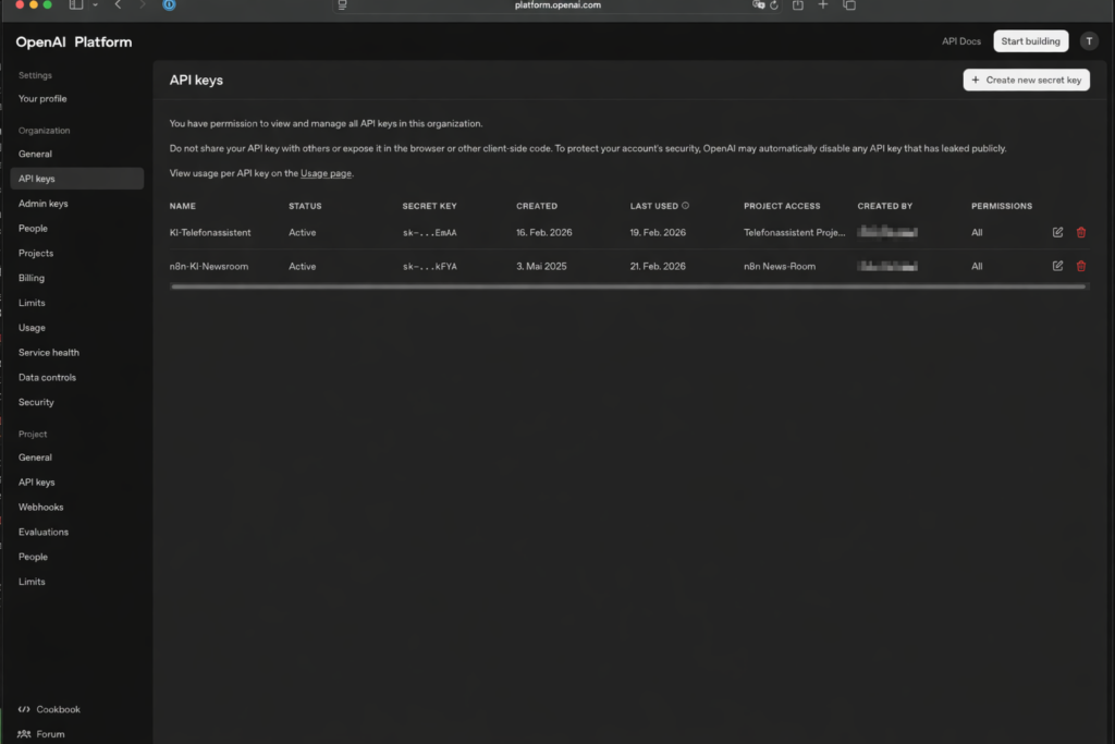 KI-Telefonassistent - Kopiere den Key sofort und speichere ihn im Passwortmanager – Keys werden nur einmal vollständig angezeigt