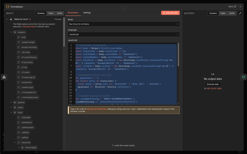 - n8n erstellt eine formatierte E-Mail mit Anrufernummer, Name, Anliegen, Dringlichkeit und vollständigem Gesprächsverlauf