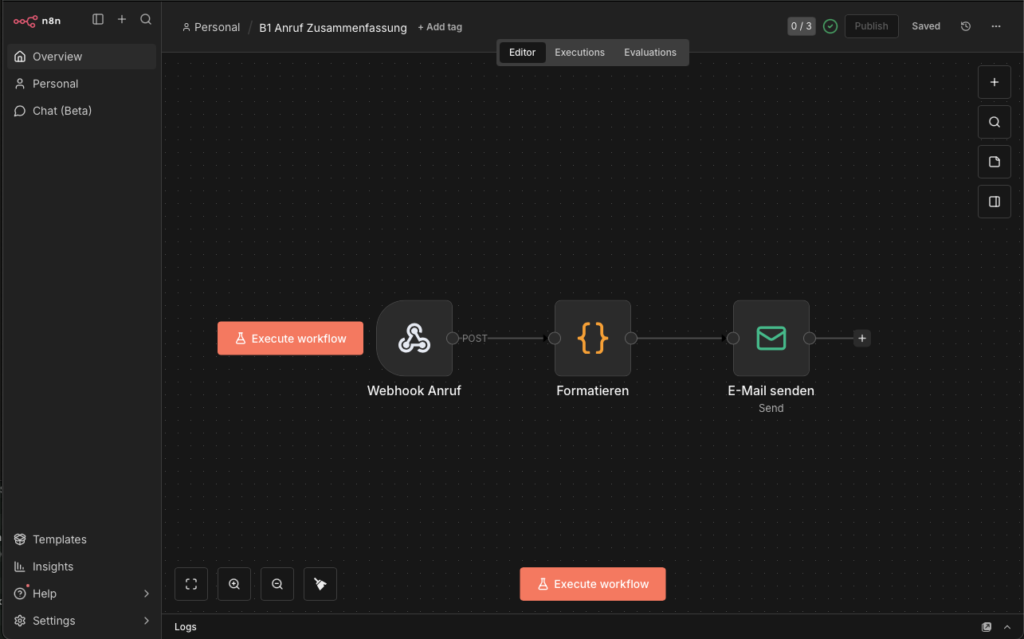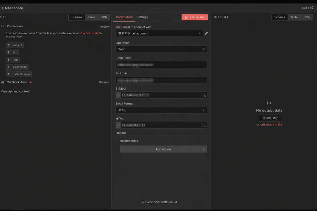 OpenAI übernimmt dabei die komplette Gesprächsintelligenz: Spracherkennung, KI-Antworten und Text-to-Speech in einem einzigen Modell mit sehr niedriger Latenz. Nach dem Gespräch sendet das Relay das Transkript per Webhook an n8n, das daraus eine formatierte E-Mail erstellt.