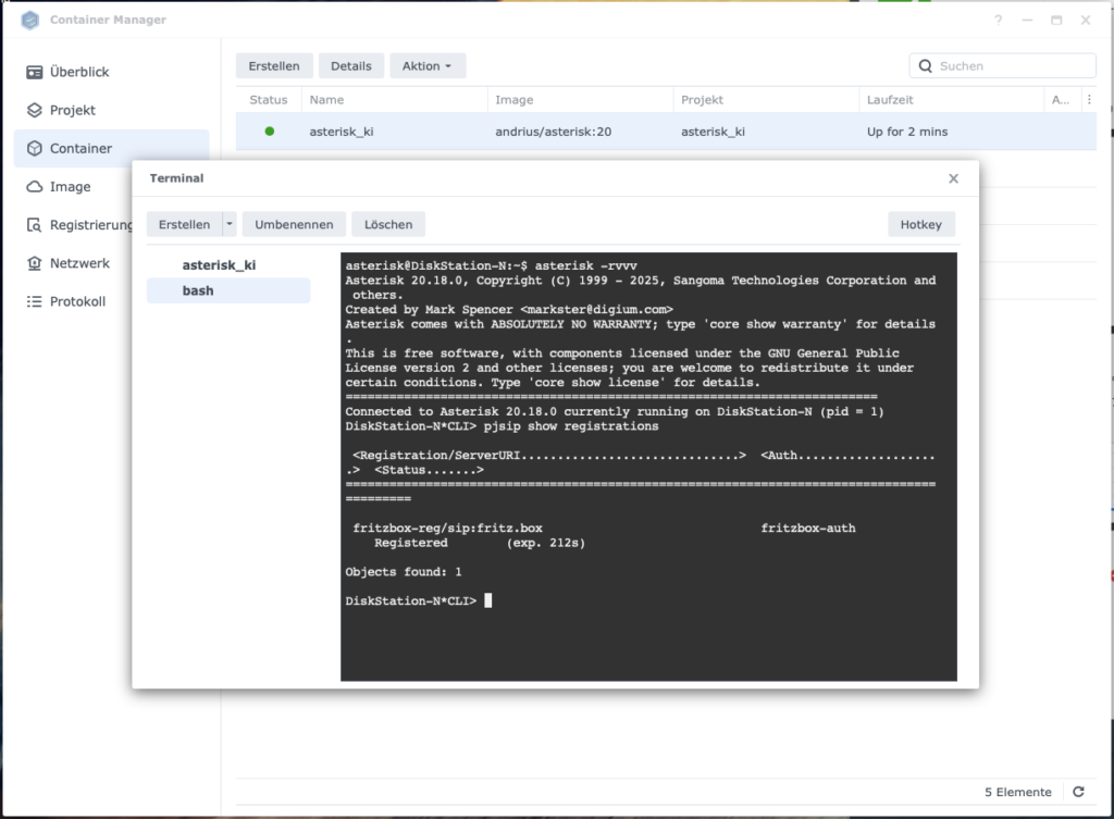| Asterisk 20 (Docker) | Telefonie-Server: SIP-Registrierung, Anrufsteuerung via ARI |